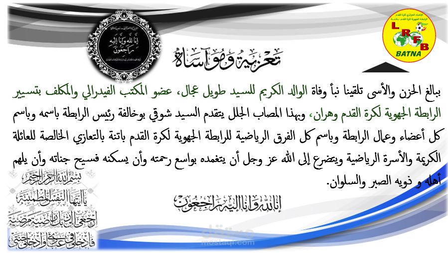 وفاة الوالد الكريم للسيد طويل عجال، عضو المكتب الفيدرالي والمكلف بتسيير الرابطة الجهوية لكرة القدم وهران |
