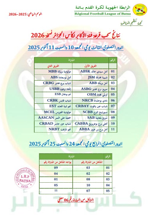 نتائج سحب قرعة فئة الأكابر لكأس الجزائر نسخة 2026 ... الدور التصفوي الثالث يومي الجمعة 10 والسبت 11 أكتوبر 2025 |