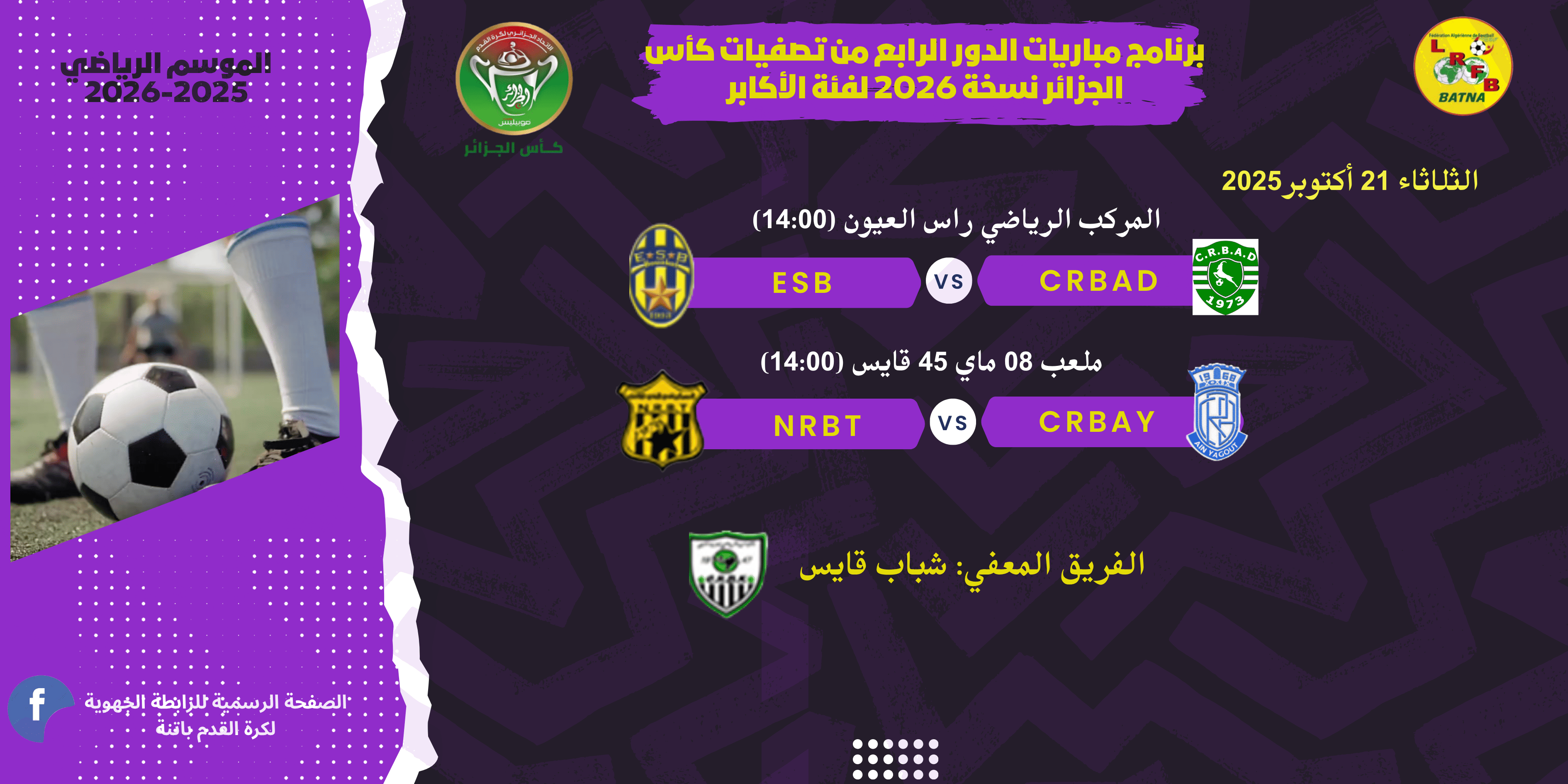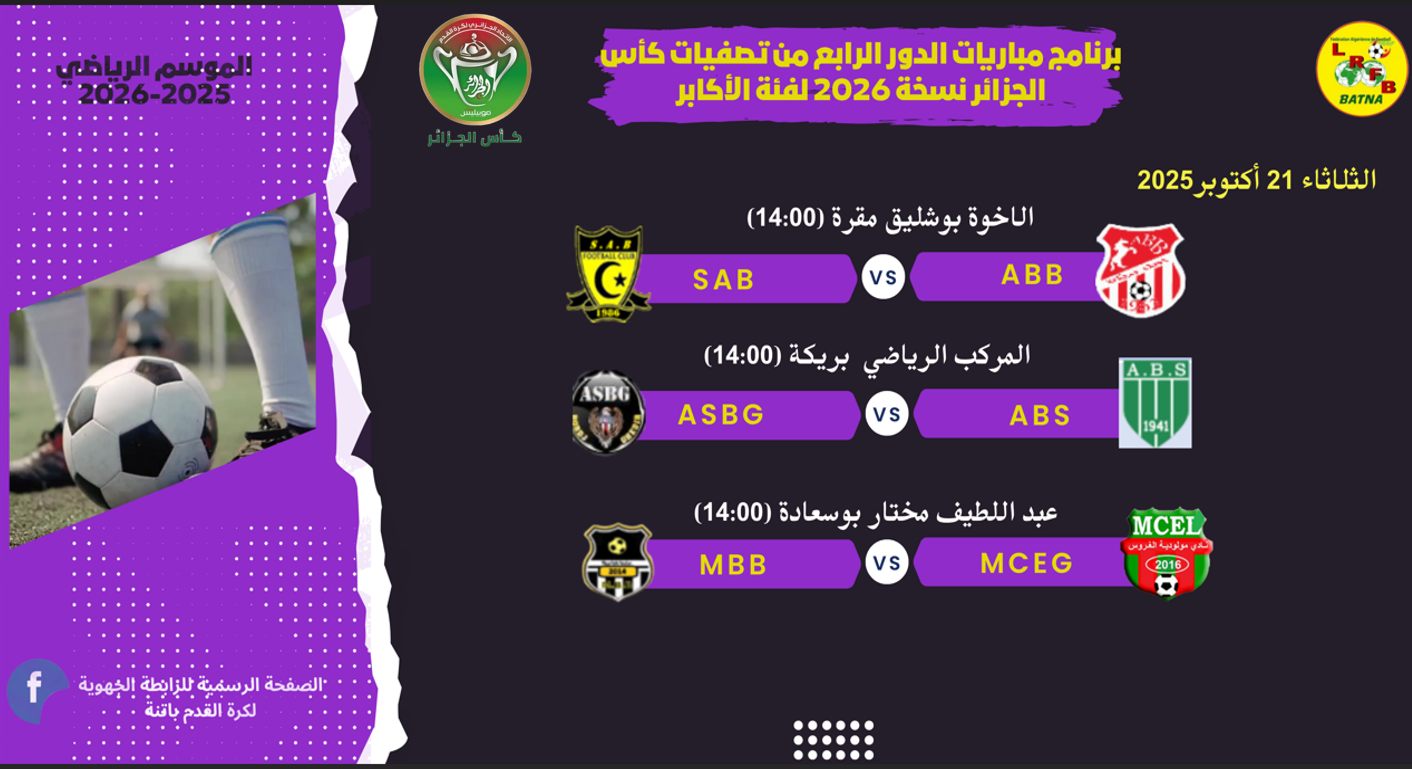برنامج مقابلات الدور الجهوي الرابع "أكابر" كأس الجزائر نسخة 2026...يوم الثلاثاء 21 أكتوبر 2025 |