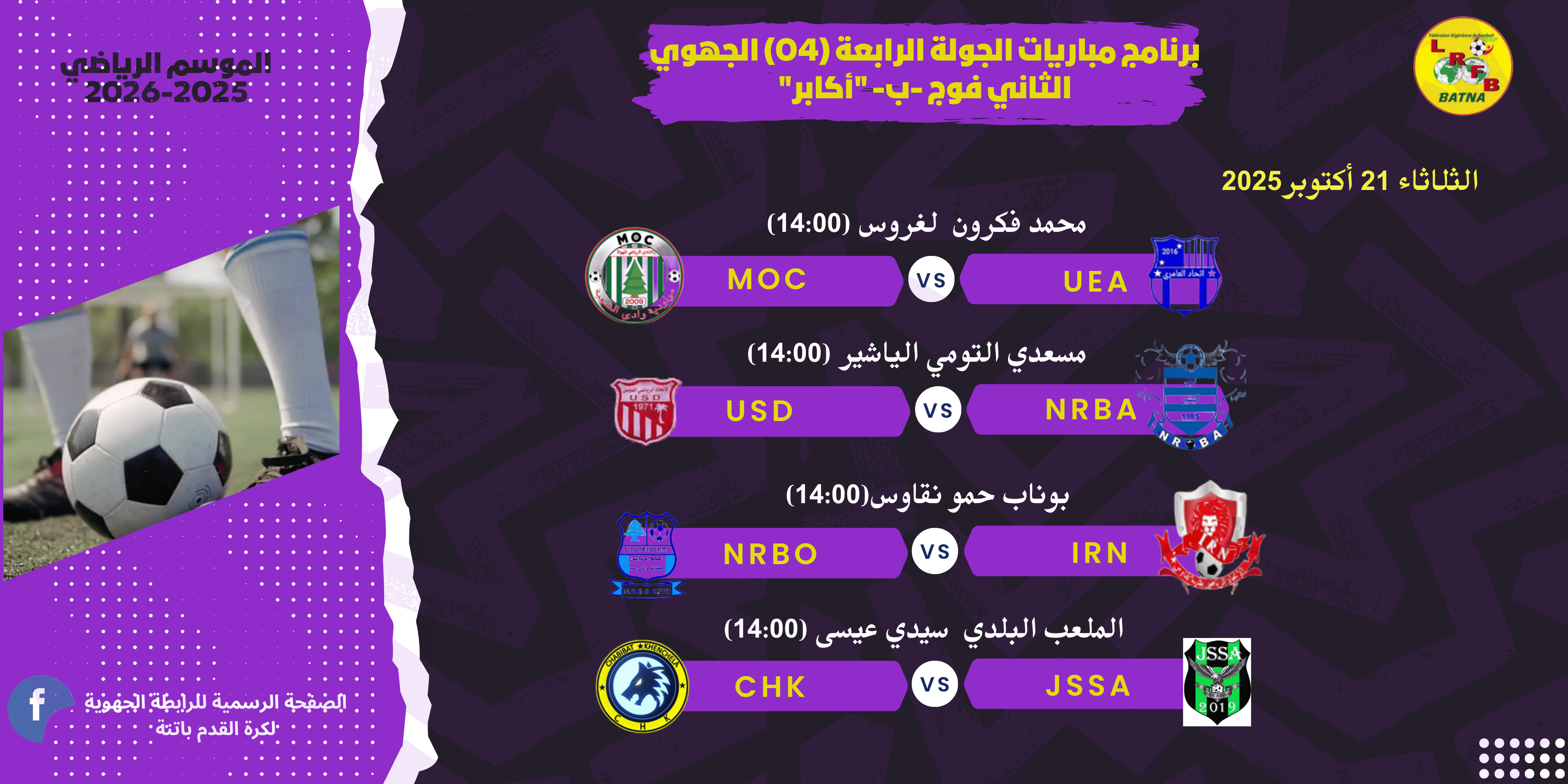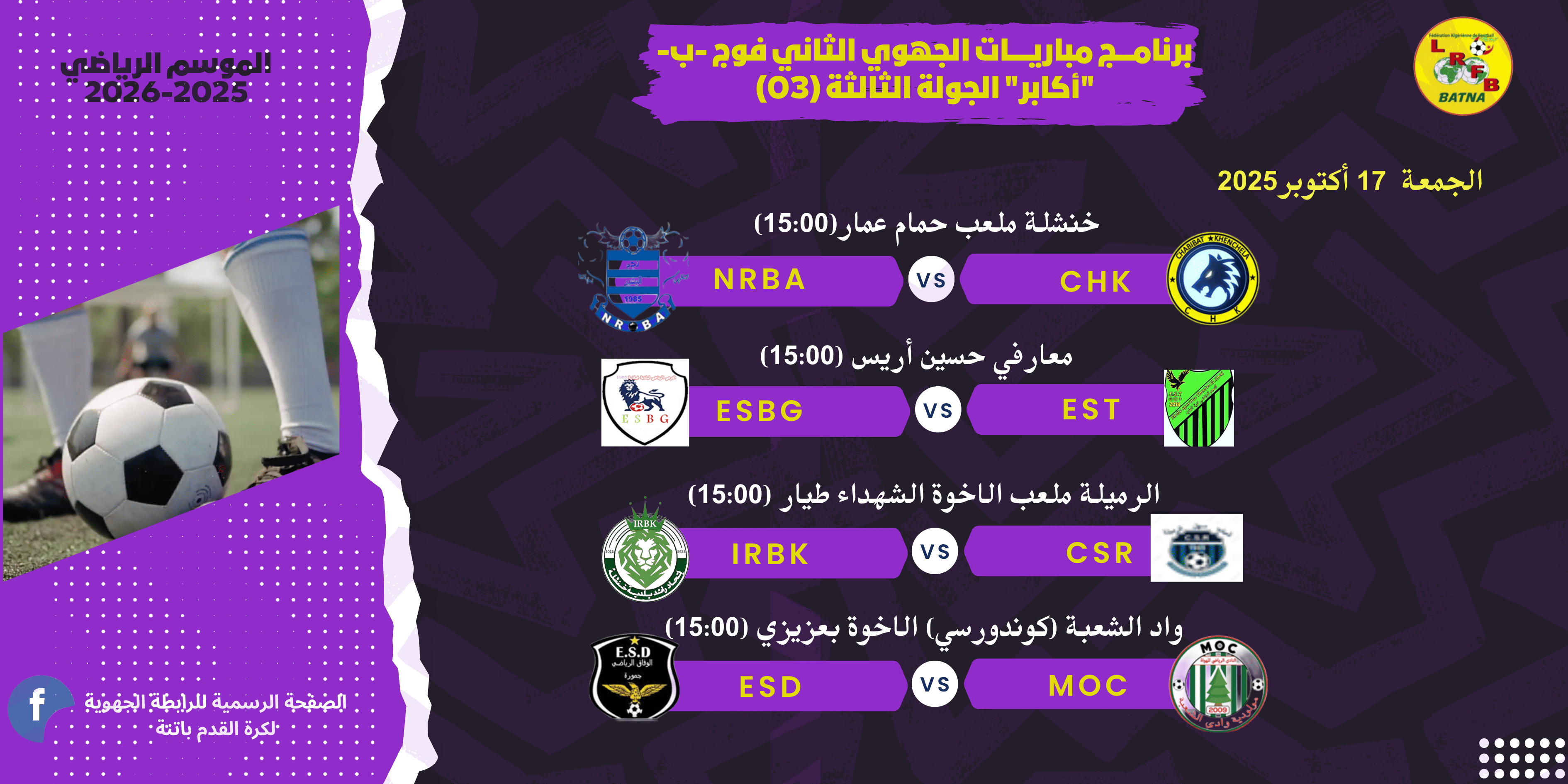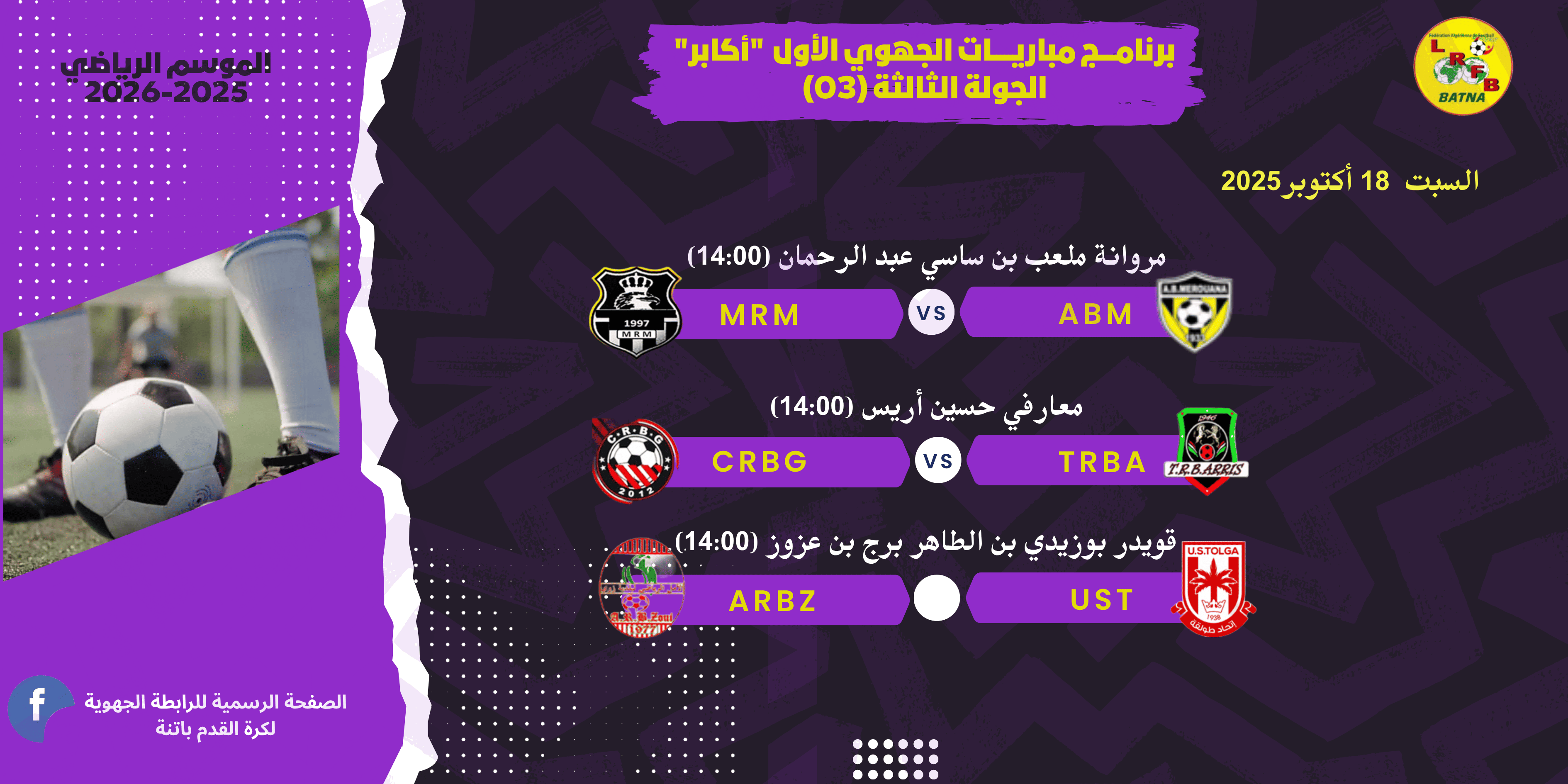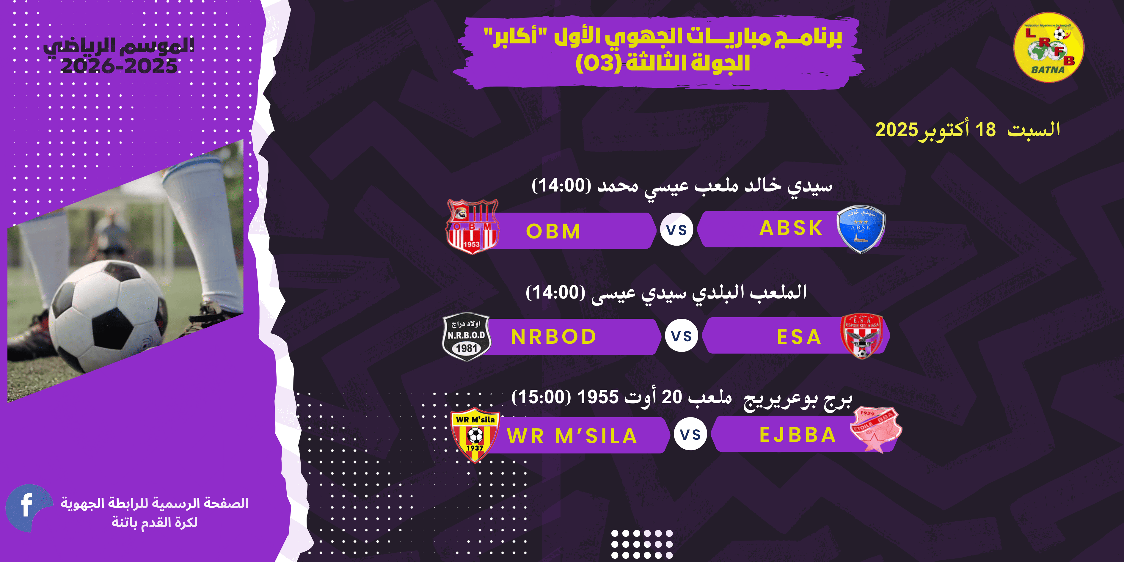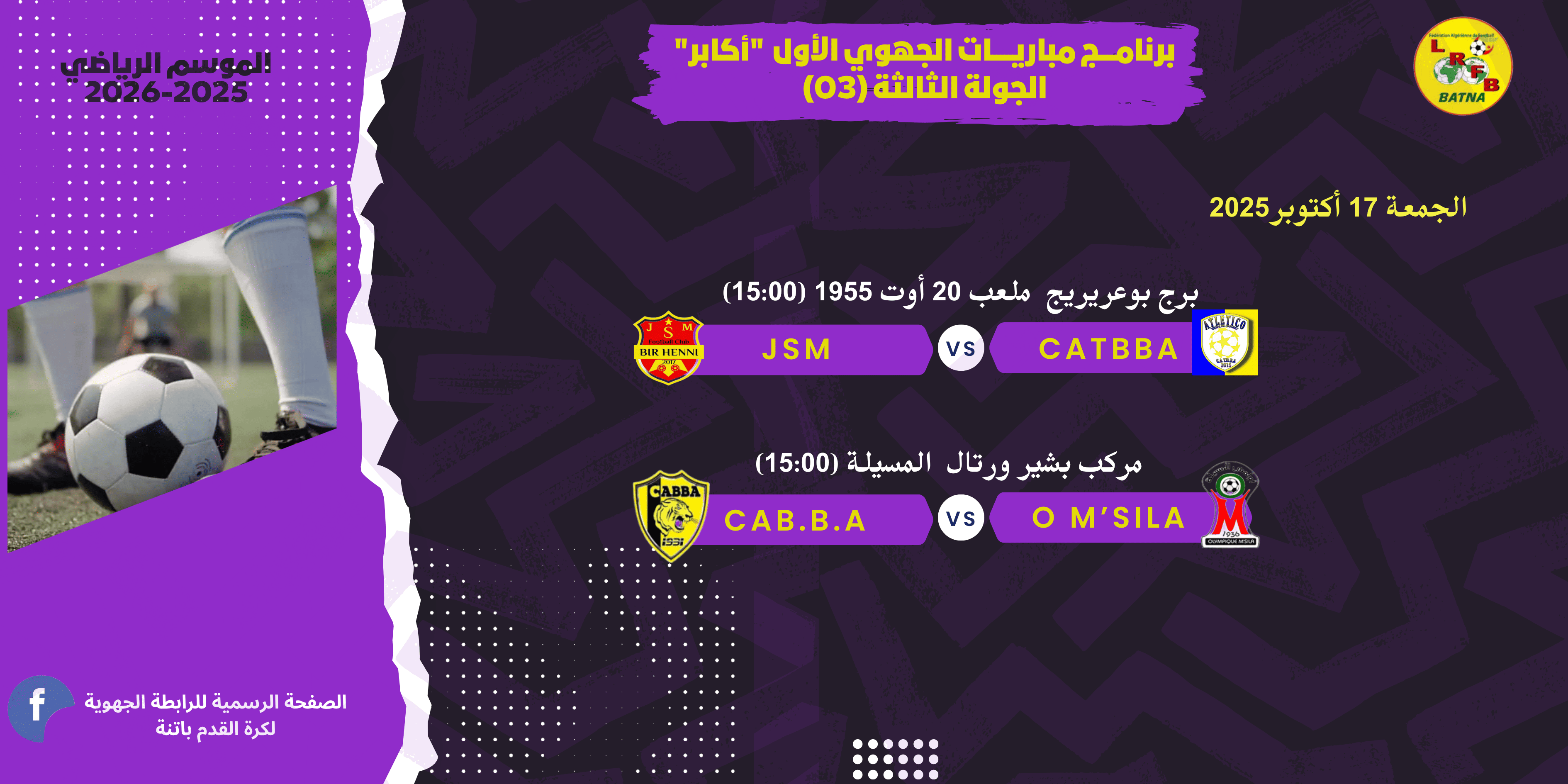 لجنة تنظيم المنافسات: 🖌 برنامج مباريات الجولة 3 - 4 من بطولة الأكابر والجولة 3 - 5 من بطولة الشبان ... 2025-2026 |