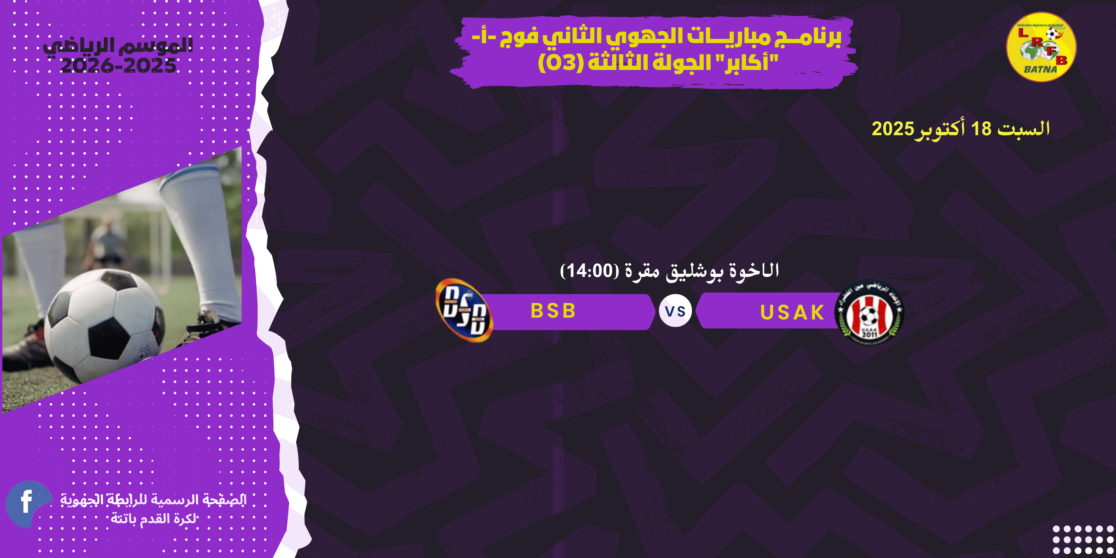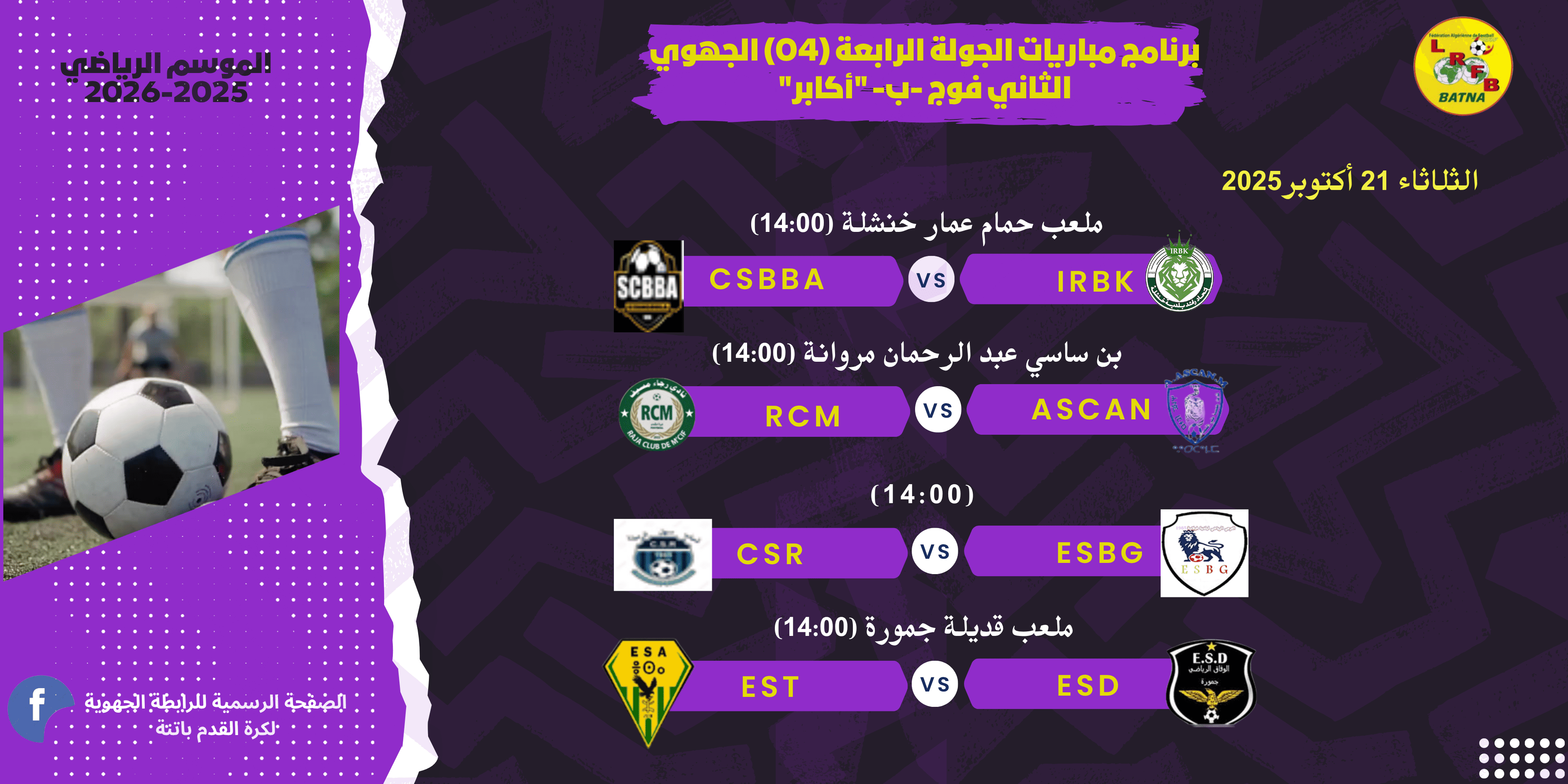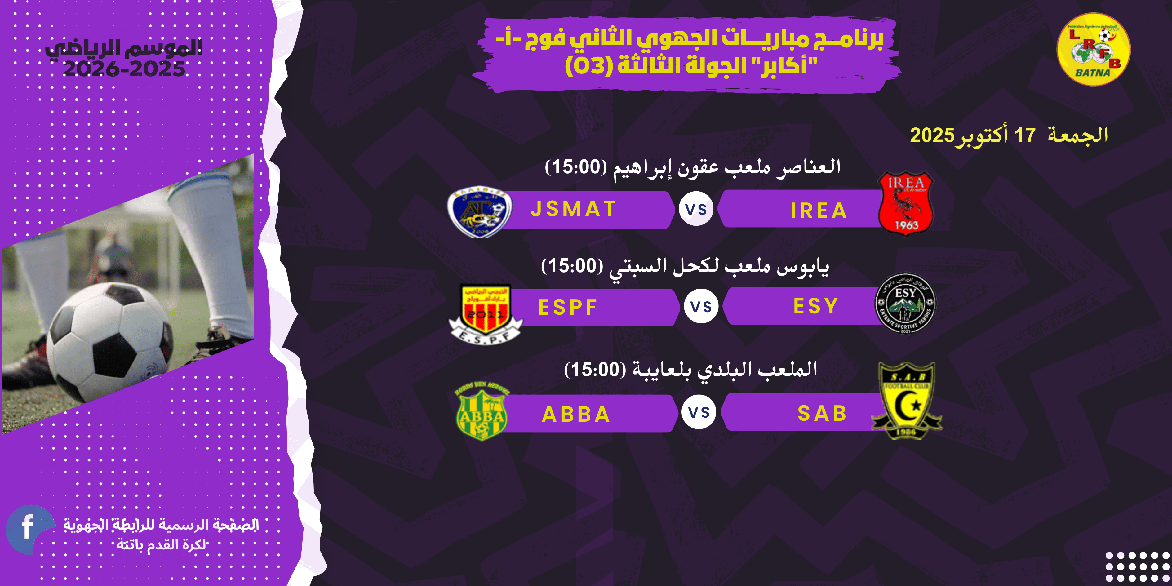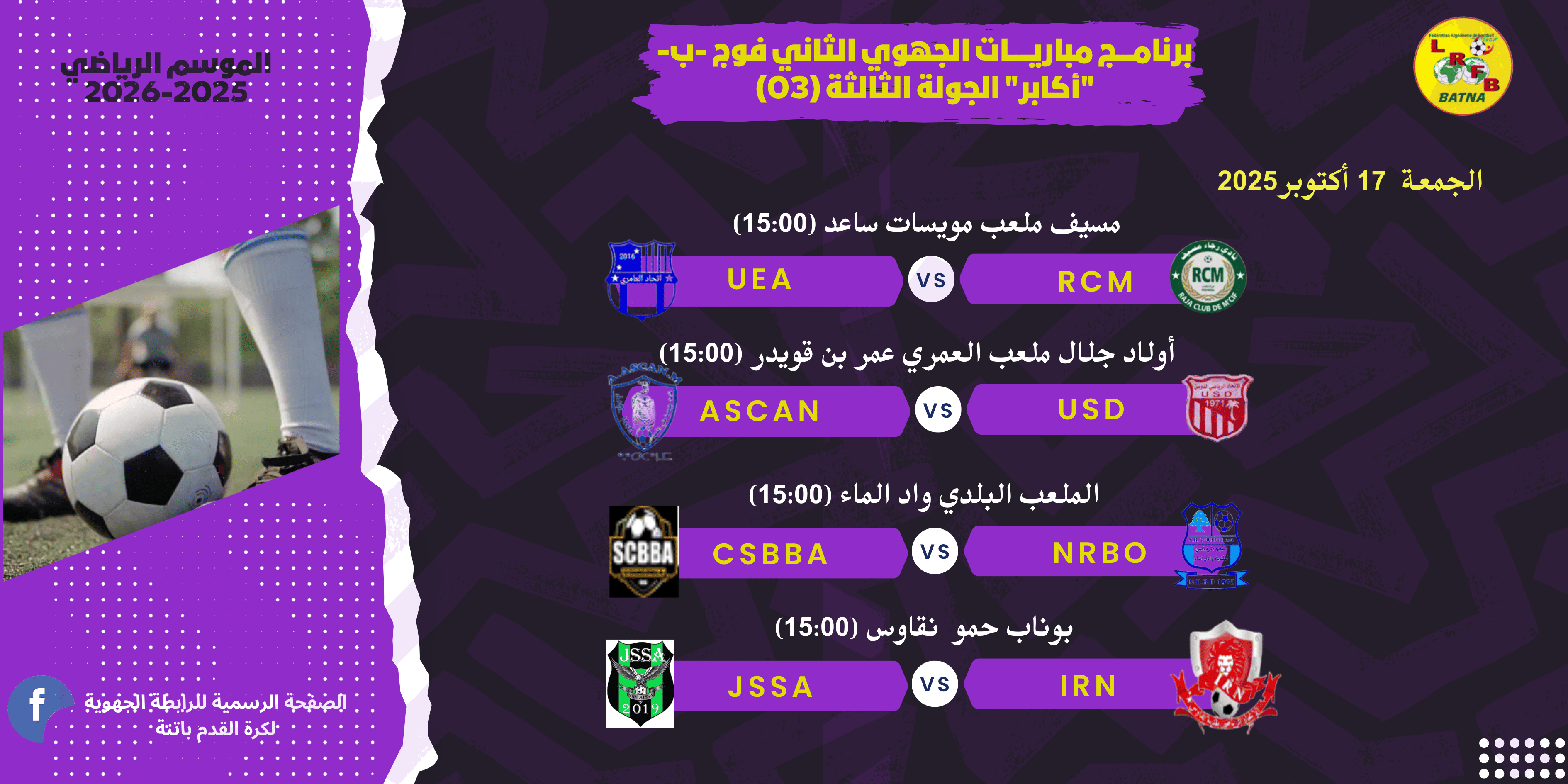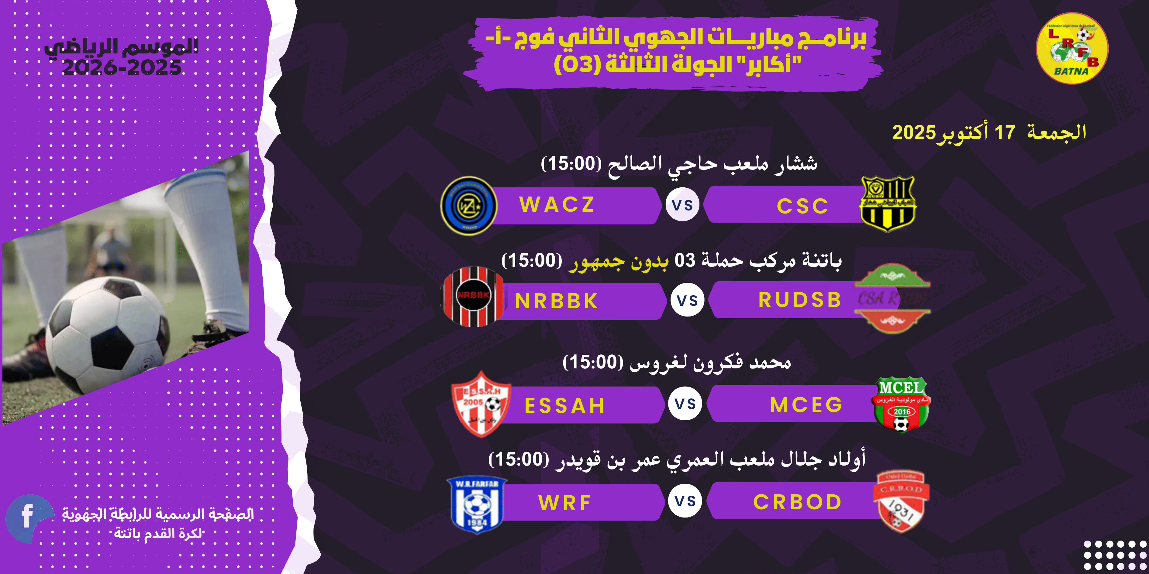 لجنة تنظيم المنافسات: 🖌 برنامج مباريات الجولة 3 - 4 من بطولة الأكابر والجولة 3 - 5 من بطولة الشبان ... 2025-2026 |