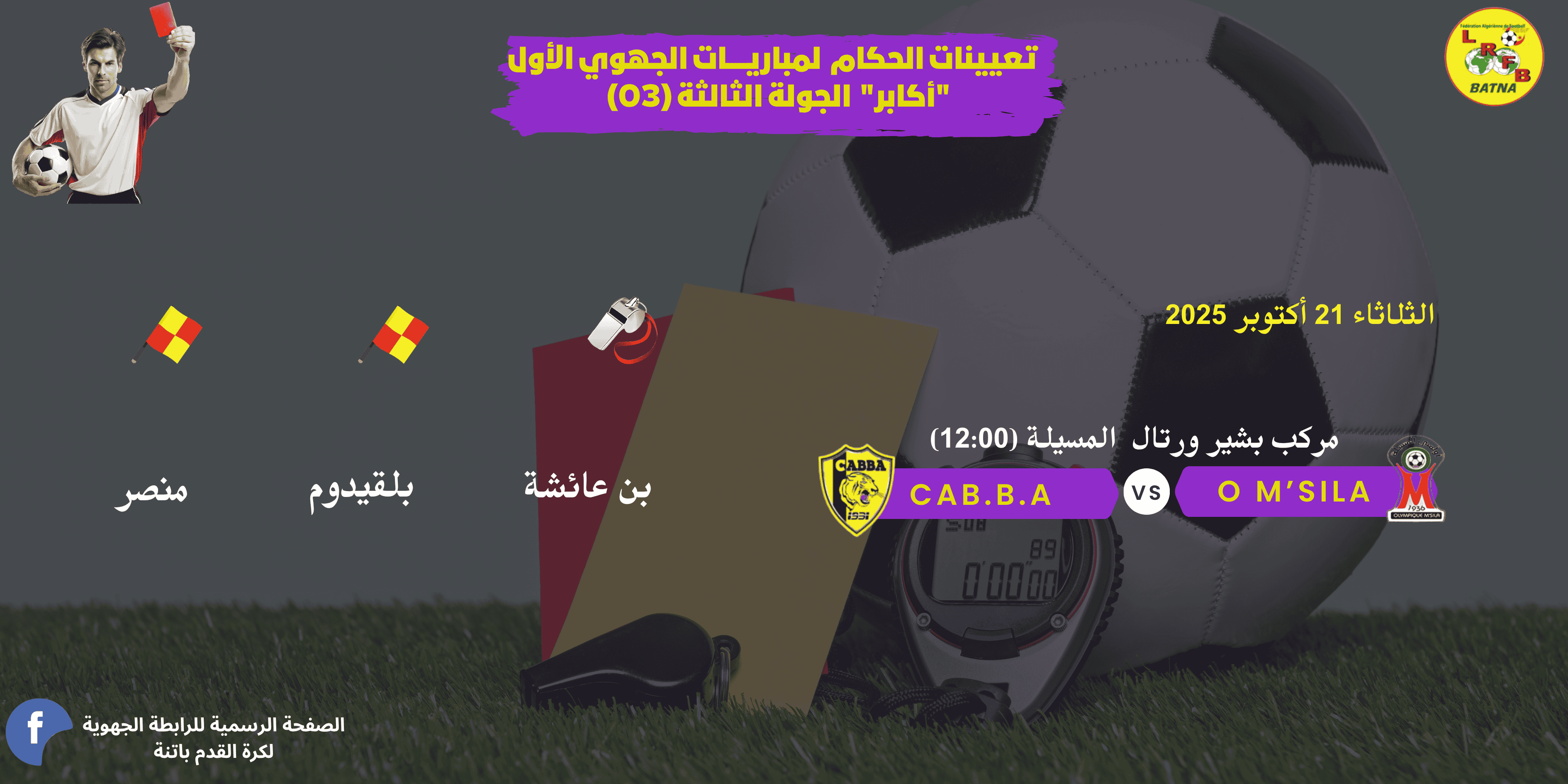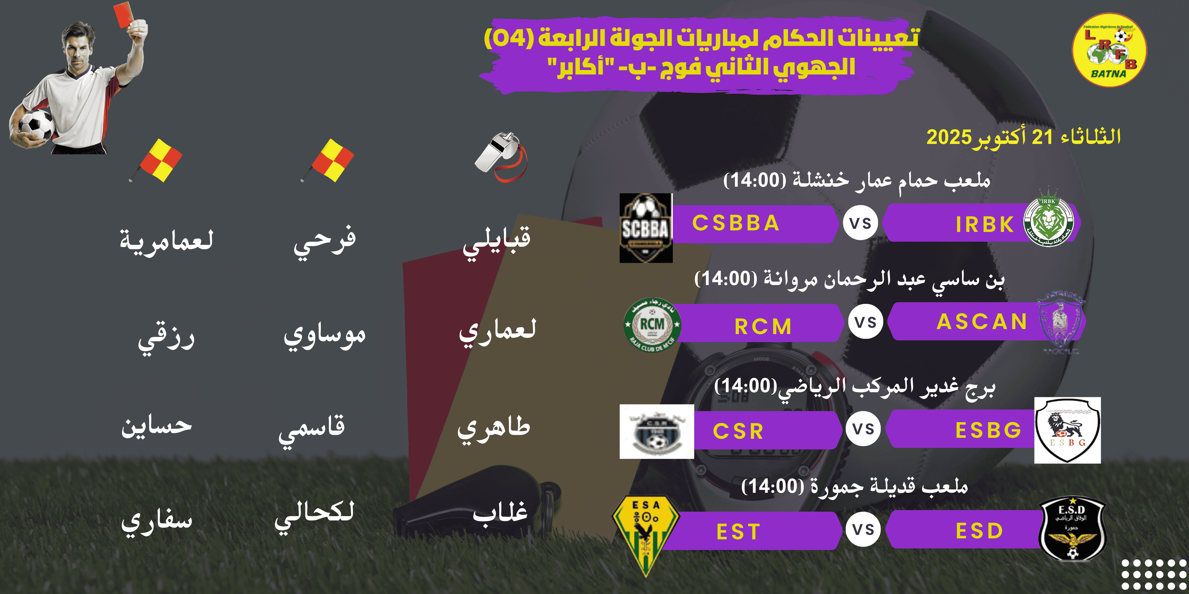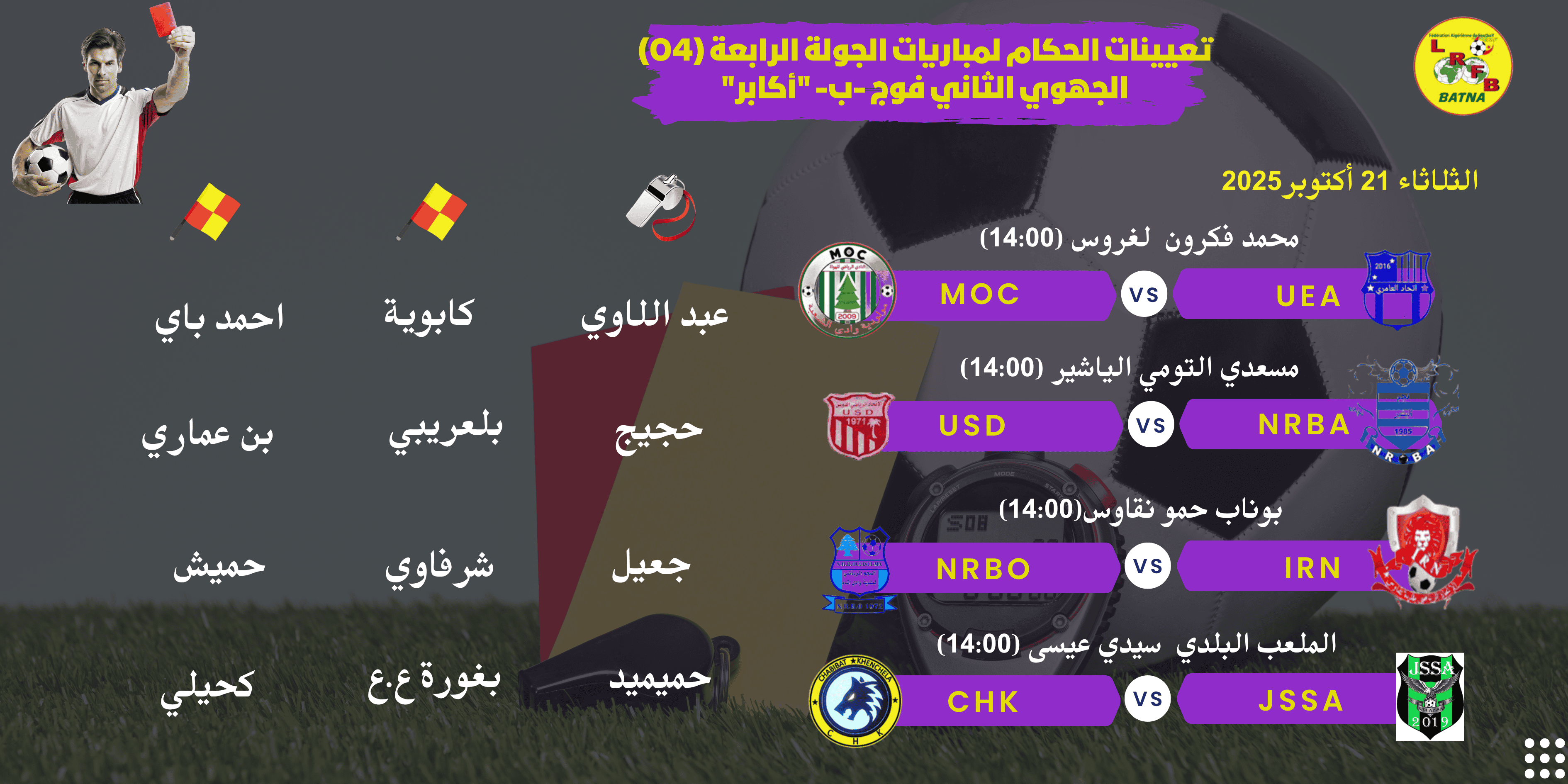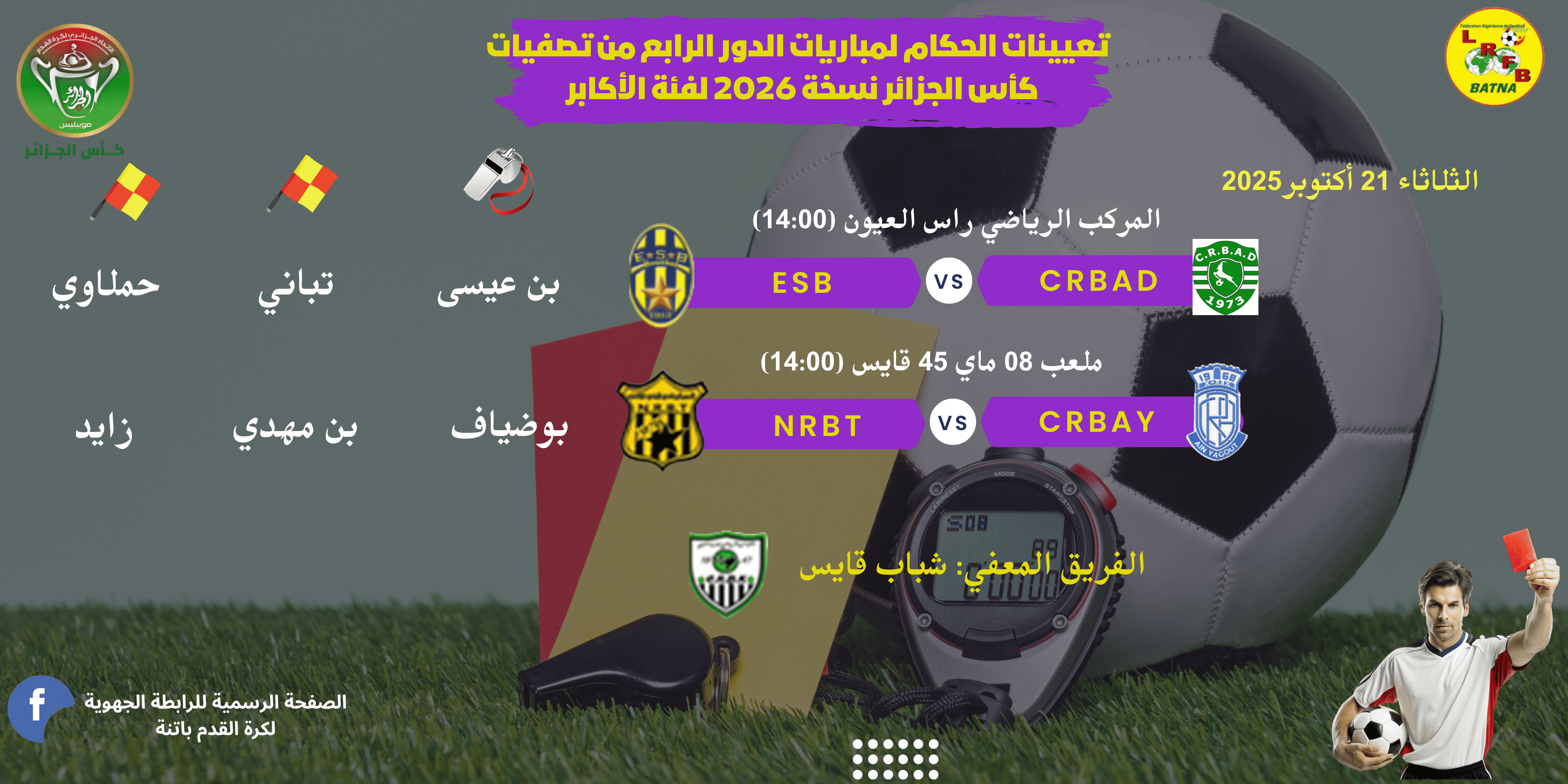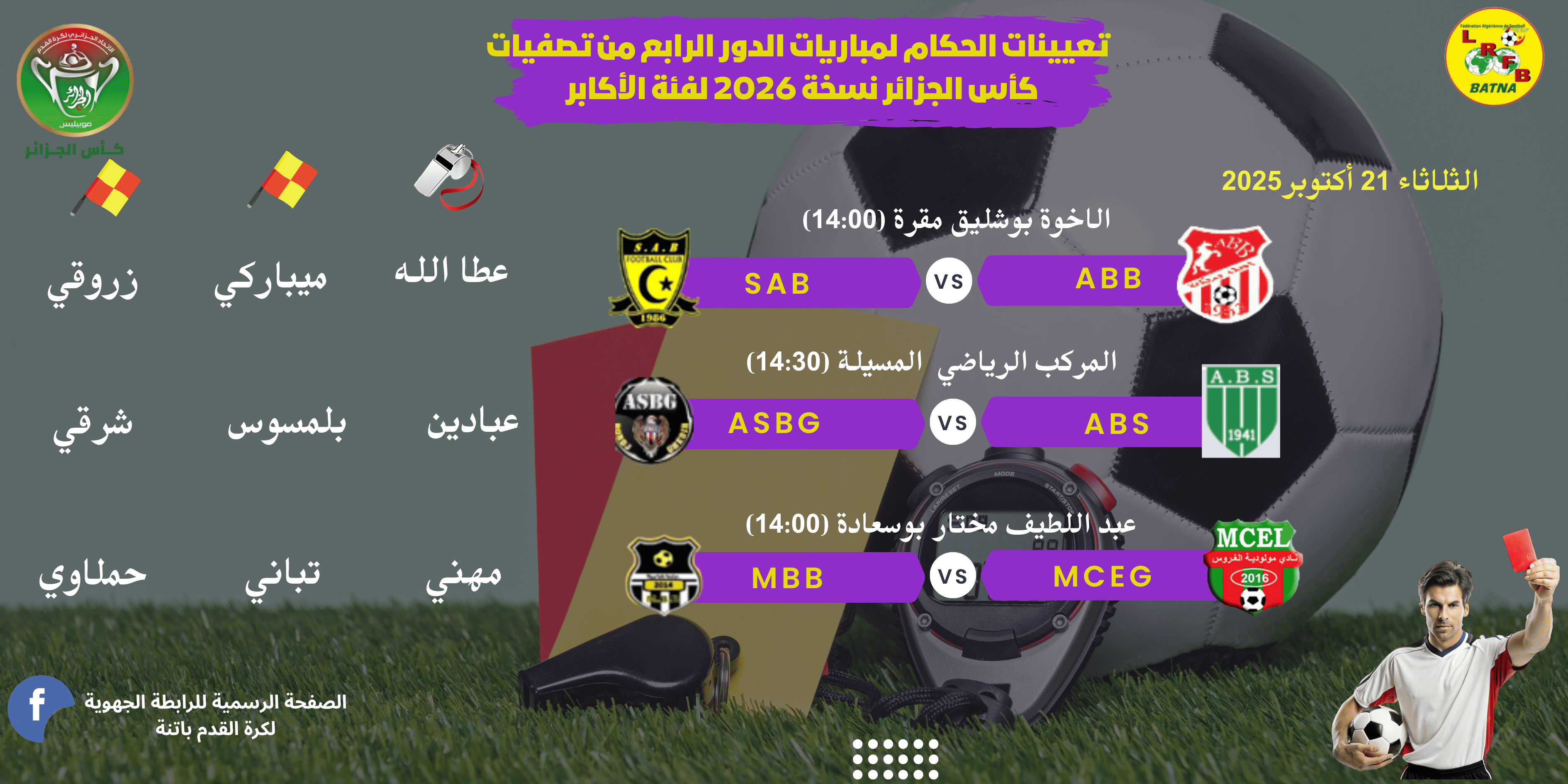 تعيينات الحكام لمباريات الدور 4 من كأس الجزائر 2025 أكابر ومباريات الجولة 4 لبطولة الجهوي 2 فوج "ب" ومباراة الجهوي الأول المتأخرة ... يوم الثلاثاء 21 أكتوبر 2025 |