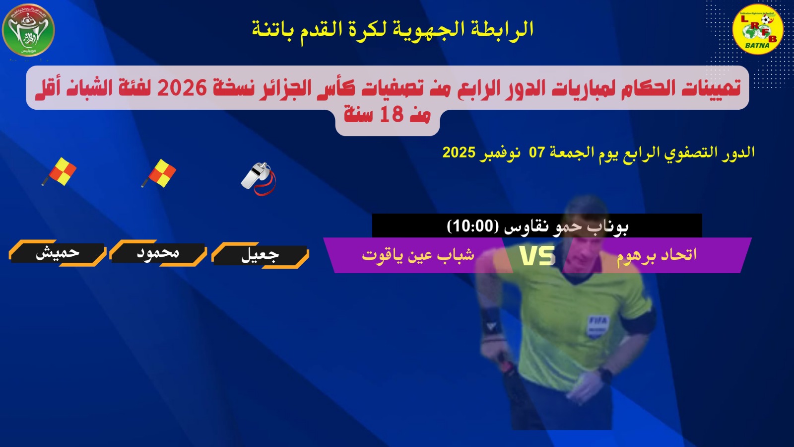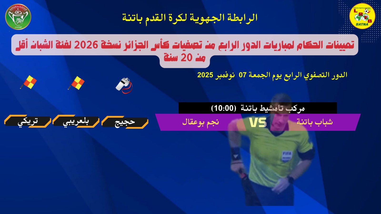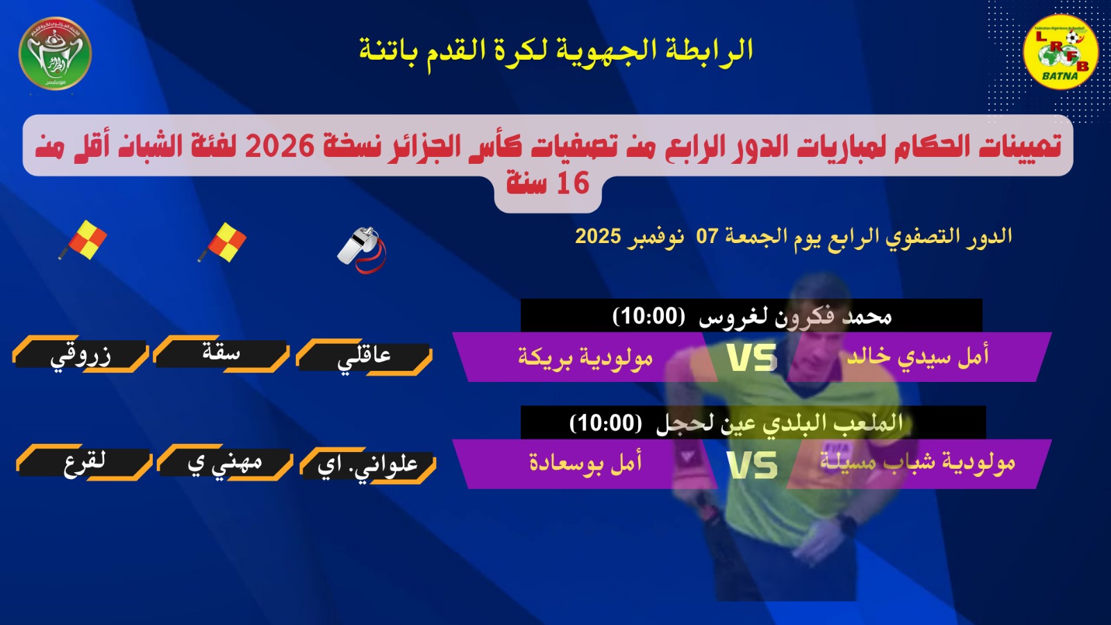 | تعيينات الحكام لمباريات الجولتين 6-7 بطولة اللقسمين الجهويين الأول والثاني ... ومباريات الدور 4 كأس الجزائر 2026 للشبان أيام الجمعة-السبت والأحد 07-08 و 09 نوفمبر 2025 |