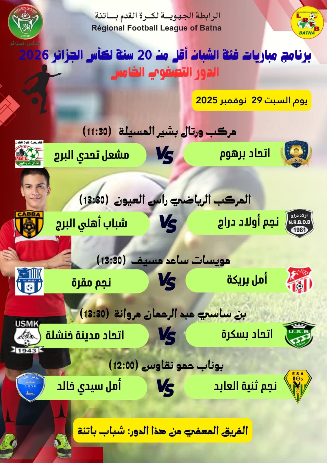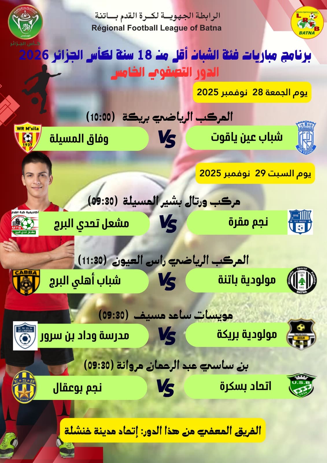 | برنامج مباريات الدّور التصفوي الخامس لكأس الجزائر 2026 للشبان |