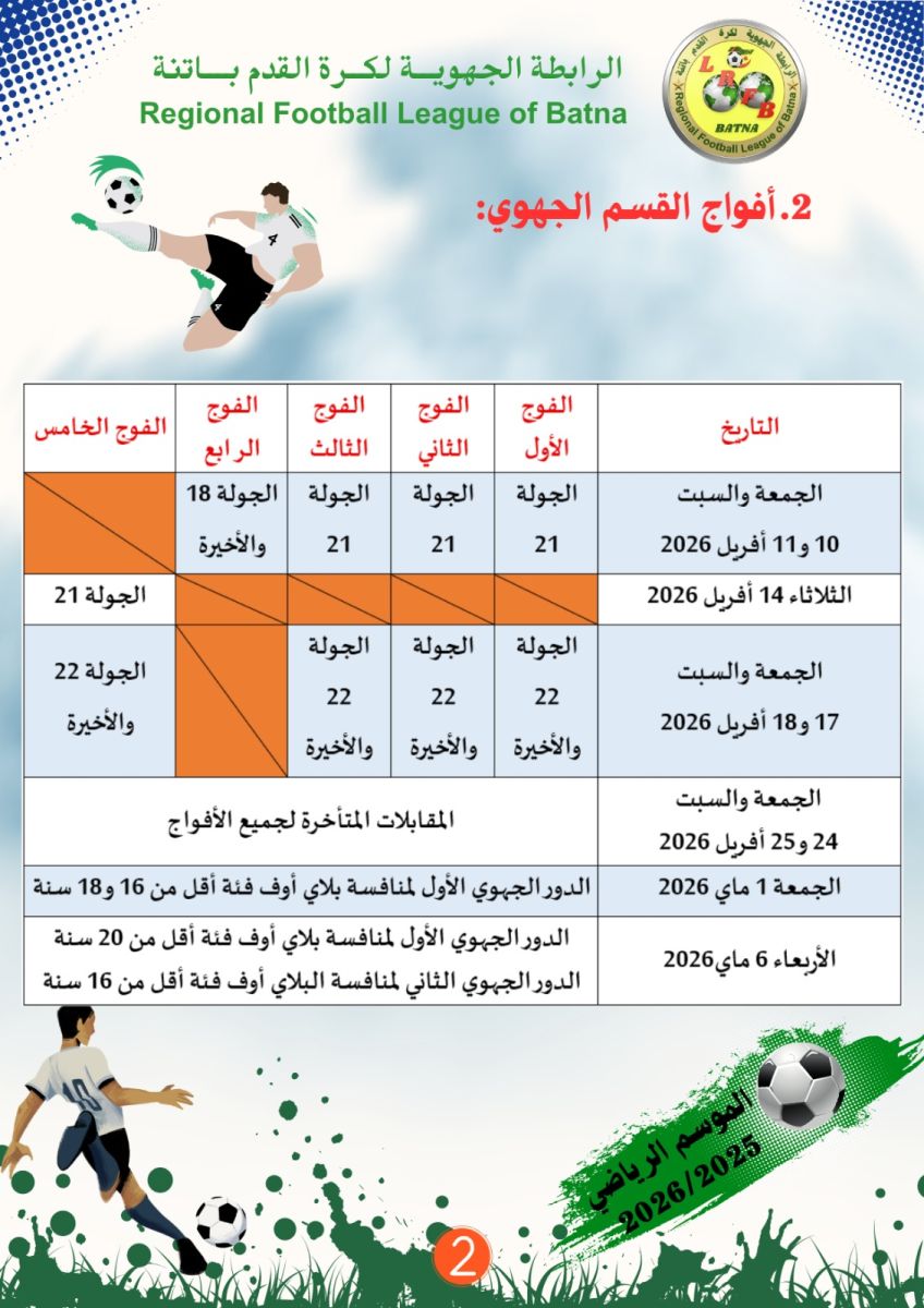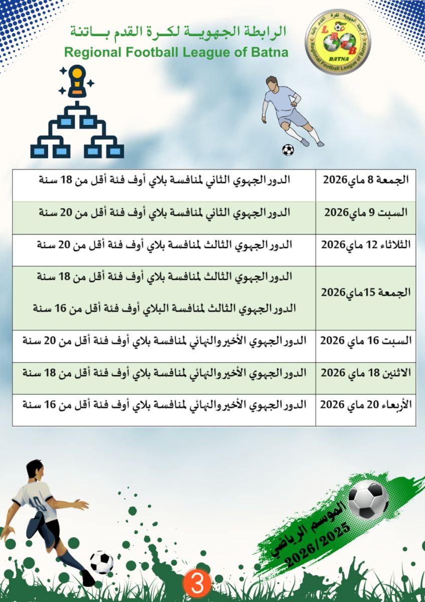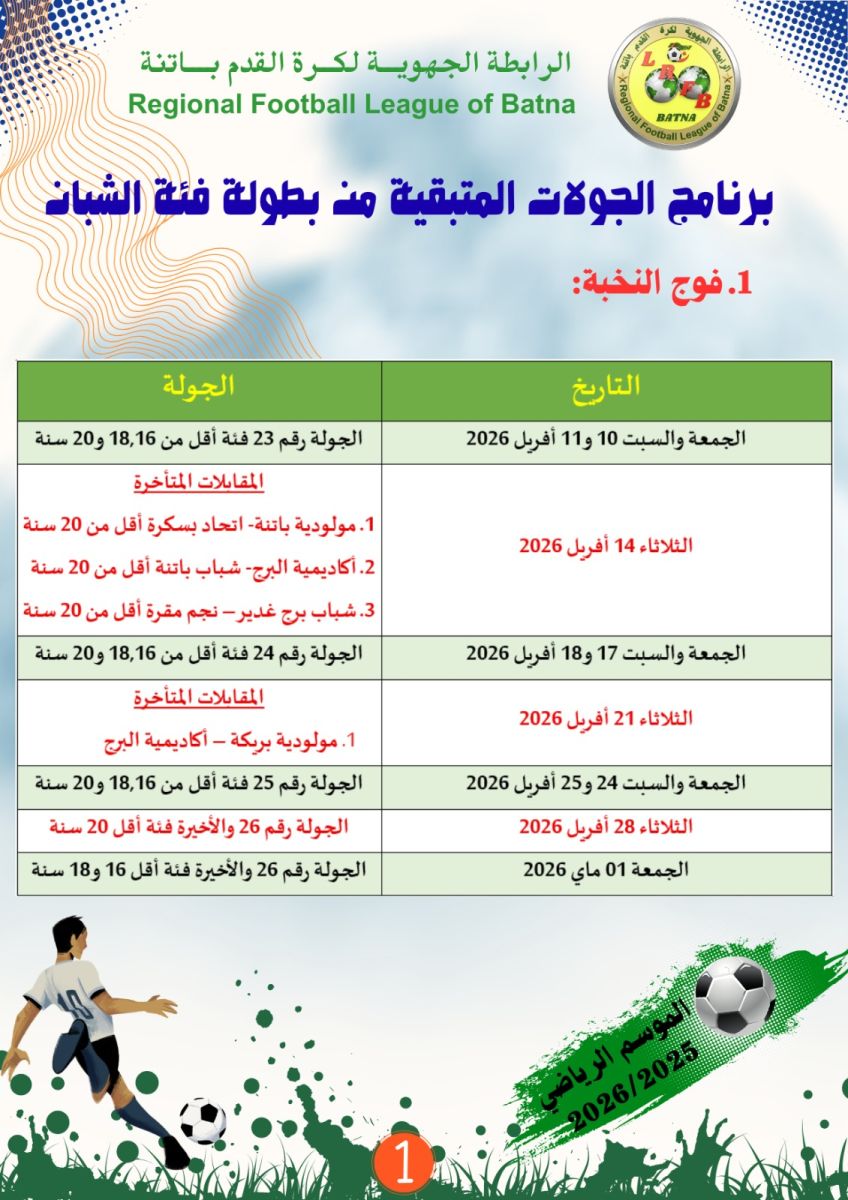 برنامج المباريات المتبقية لبطولة الفئات الشبانية...الموسم الكروي 2025-2026