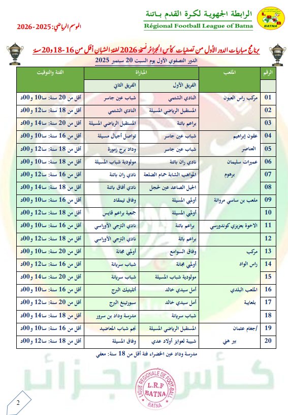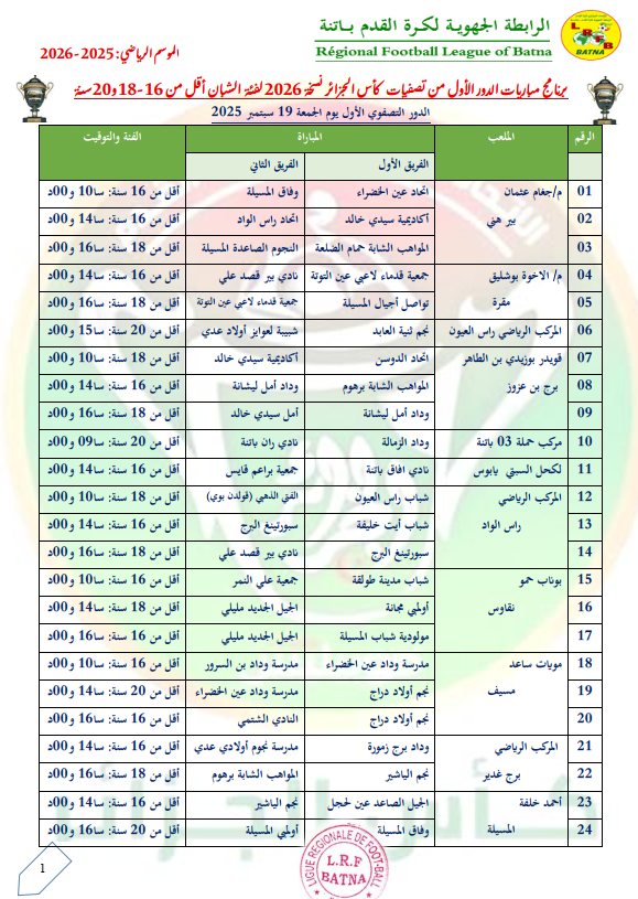 | لجنة تنظيم المنافسات: برنامج مباريات الدور الأول من تصفيات كأس الجزائر 2026 للشبان ... الدور التصفوي الأول ... يومي الجمعة و السبت 19 و20 سبتمبر 2025 |