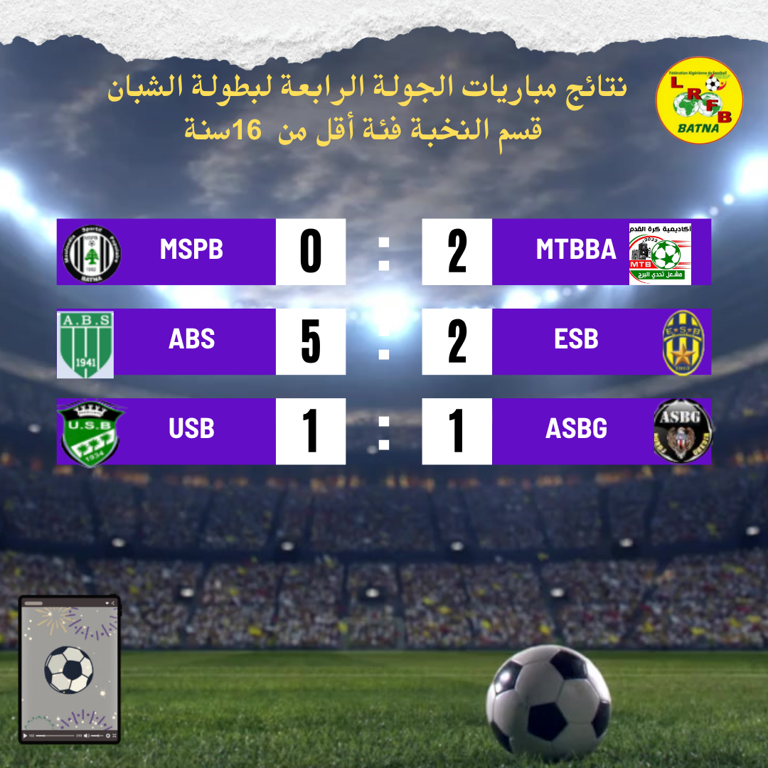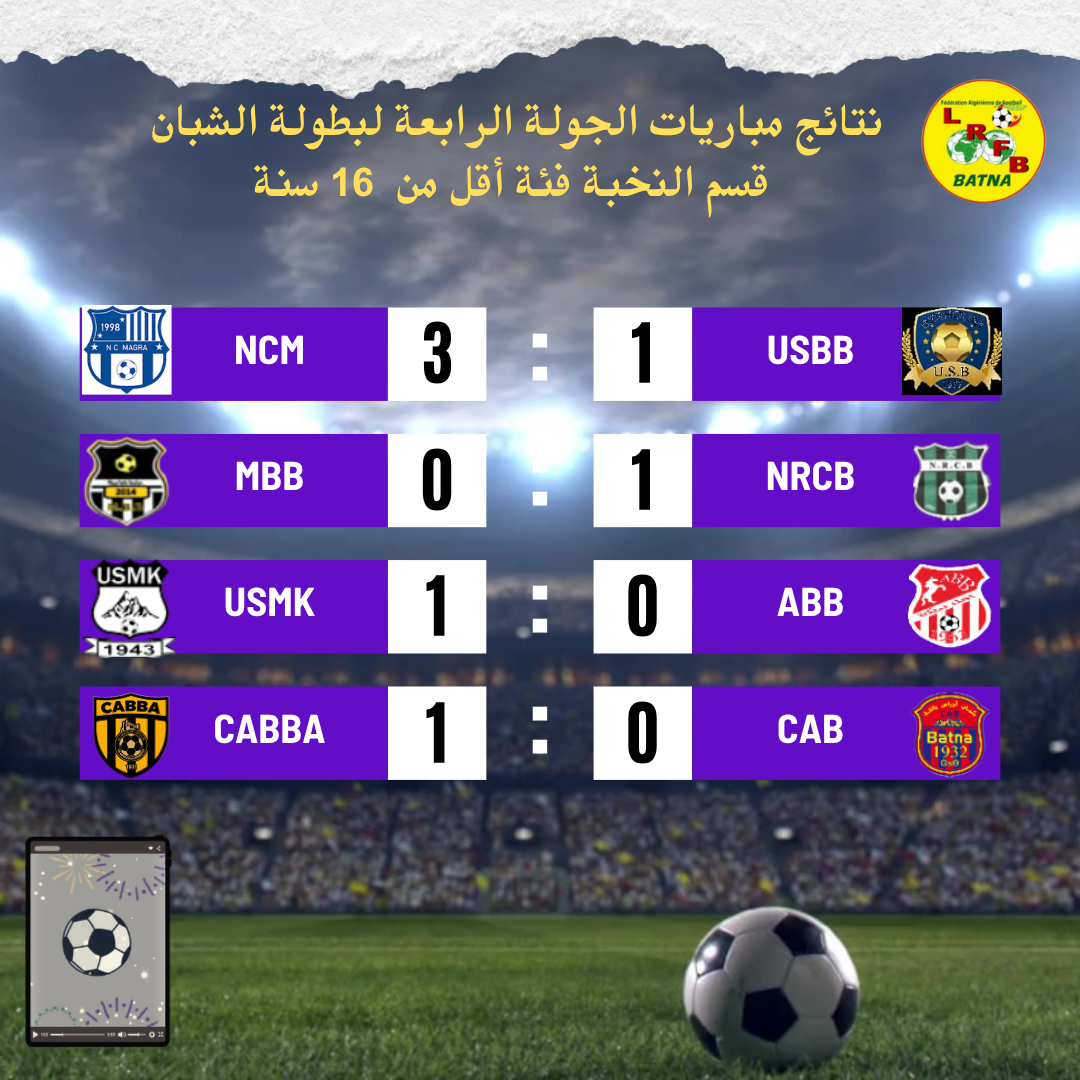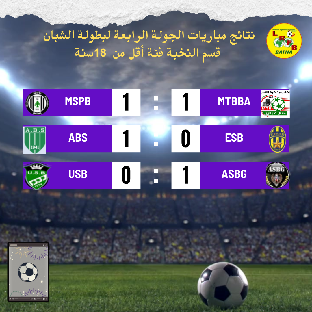 | نتائج مباريات الجولة الرابعة من بطولة قسم النخبة للفئات الشبانية ليومي الجمعة والسبت 10 و 11 أكتوبر 2025 |