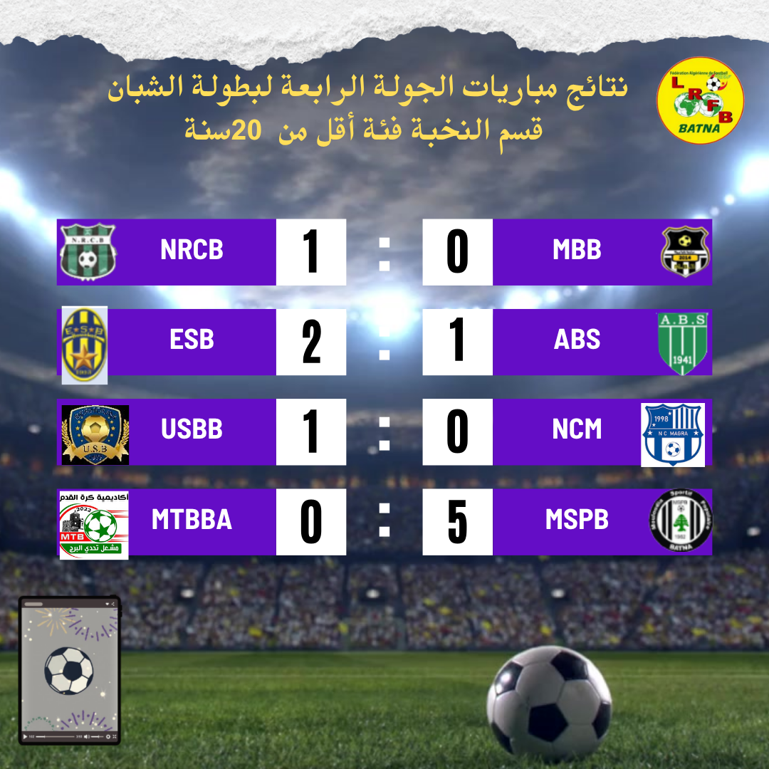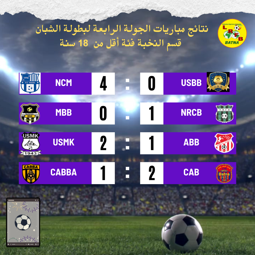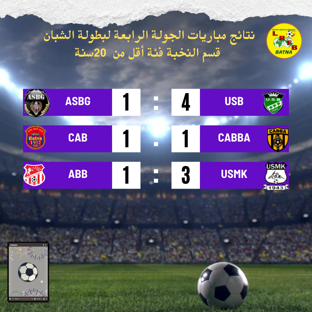 | نتائج مباريات الجولة الرابعة من بطولة قسم النخبة للفئات الشبانية ليومي الجمعة والسبت 10 و 11 أكتوبر 2025 |