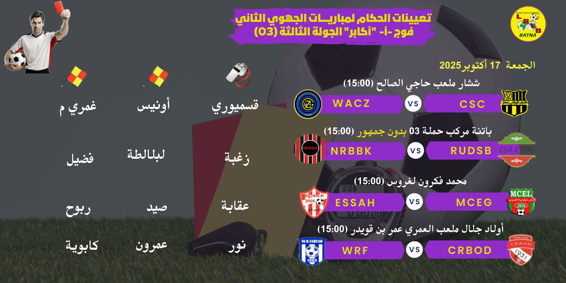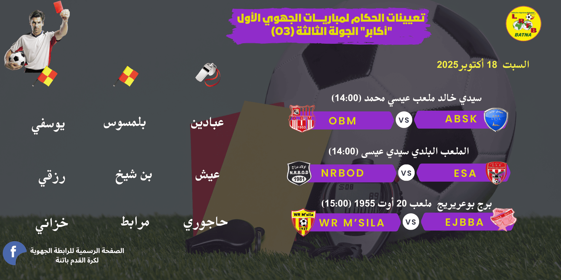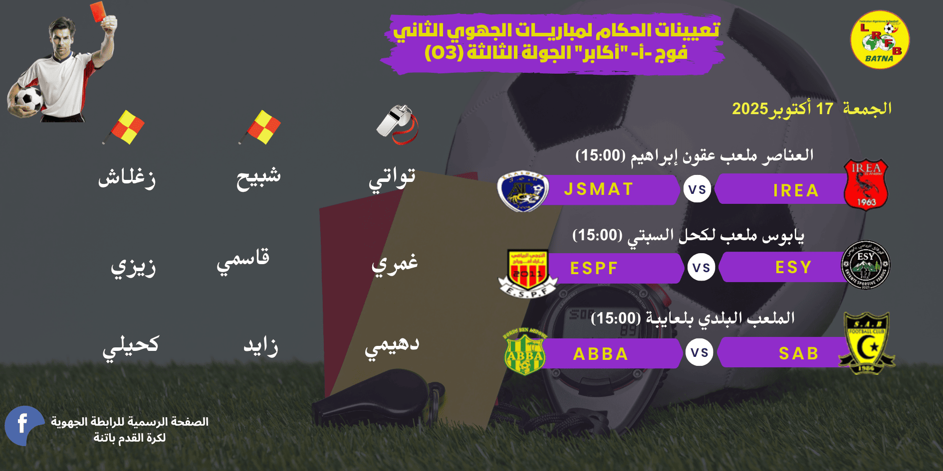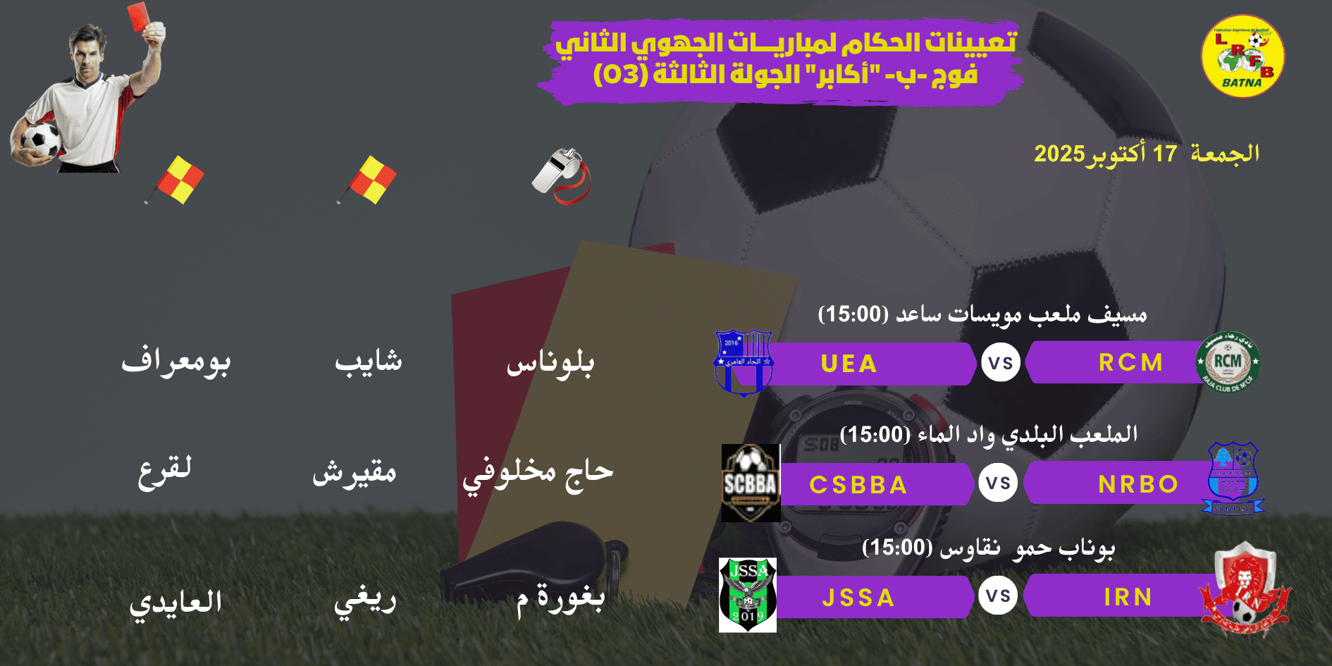 تعيينات الحكام لمباريات الجولة 3 من بطولة القسمين الجهويين "أكابر" و الجولة 4-5 من بطولة الشبان بتاريخ الجمعة والسبت 17 و 18 اكتوبر 2025 |