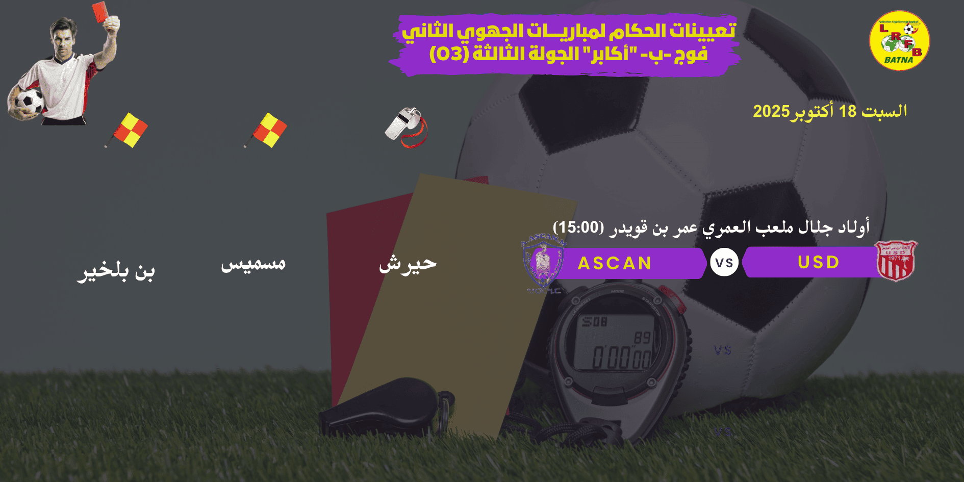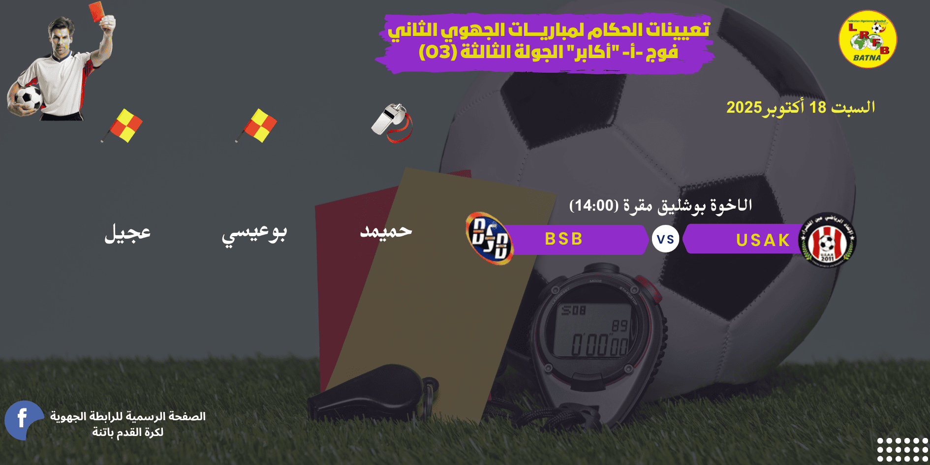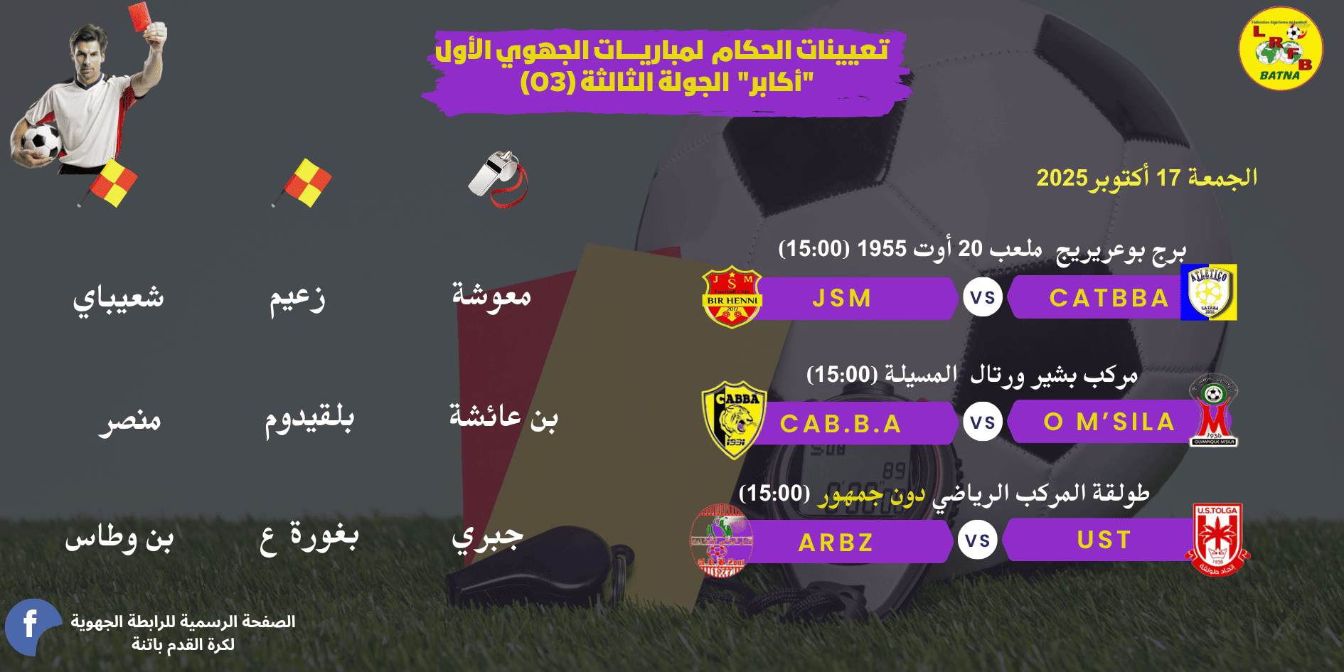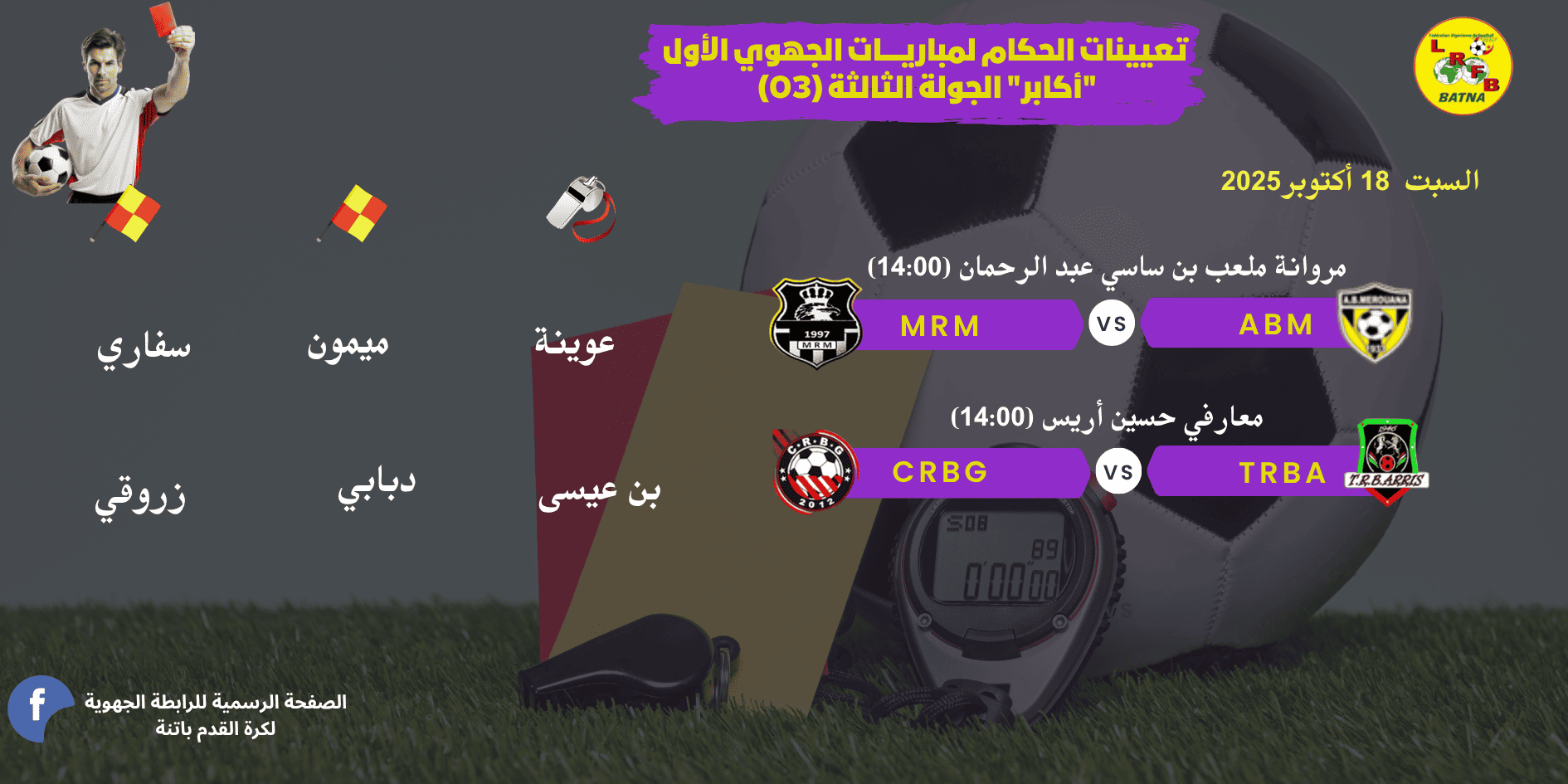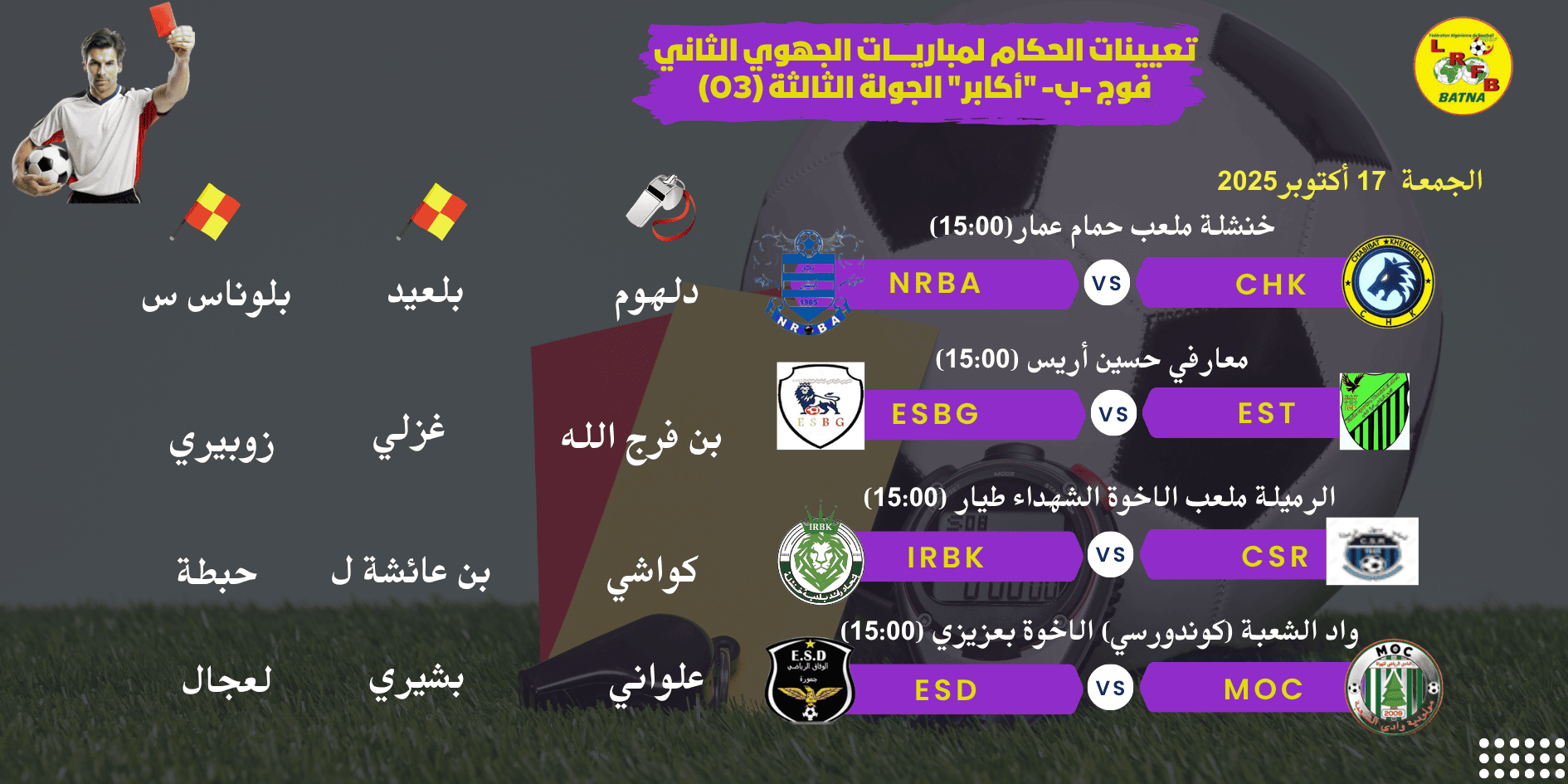 تعيينات الحكام لمباريات الجولة 3 من بطولة القسمين الجهويين "أكابر" و الجولة 4-5 من بطولة الشبان بتاريخ الجمعة والسبت 17 و 18 اكتوبر 2025 |