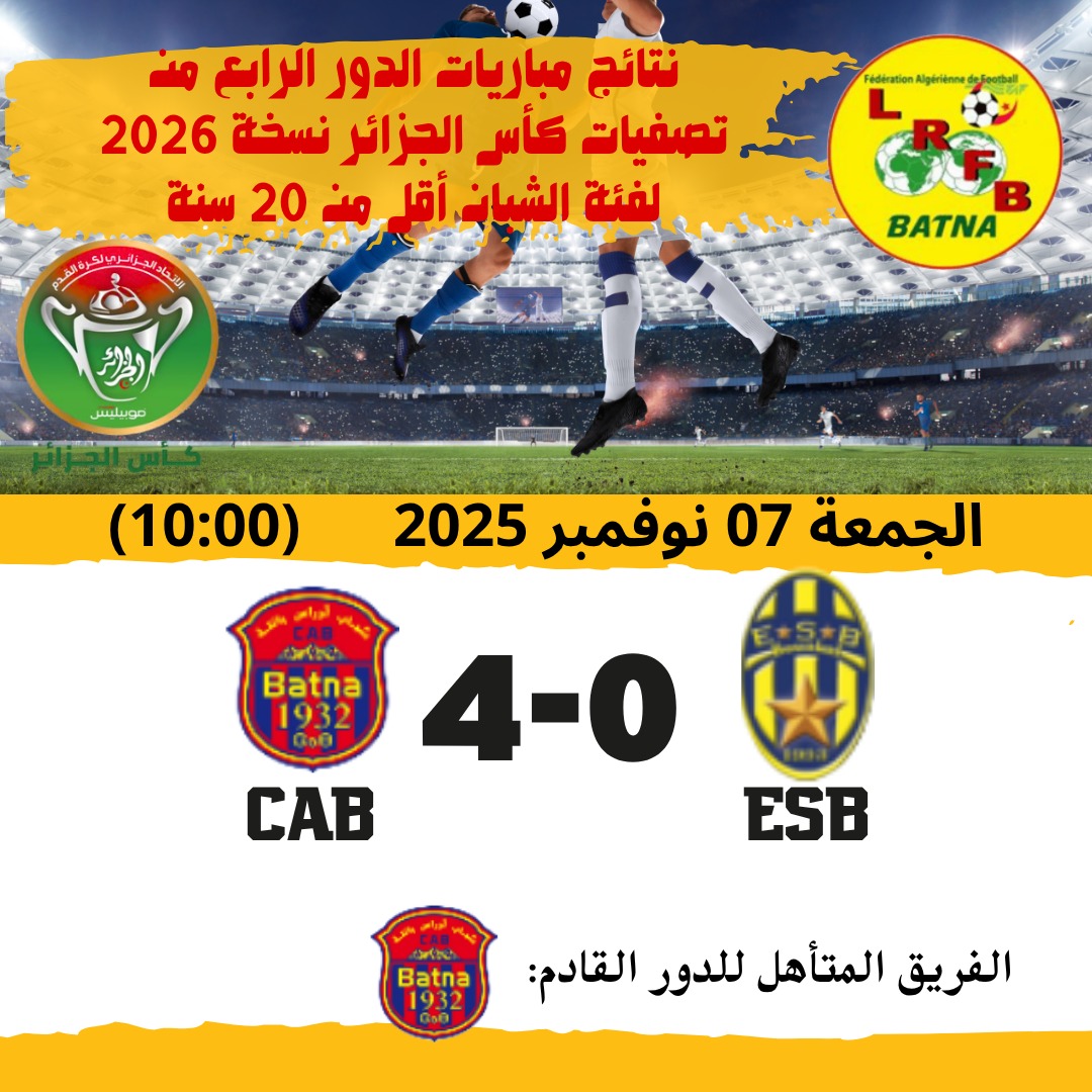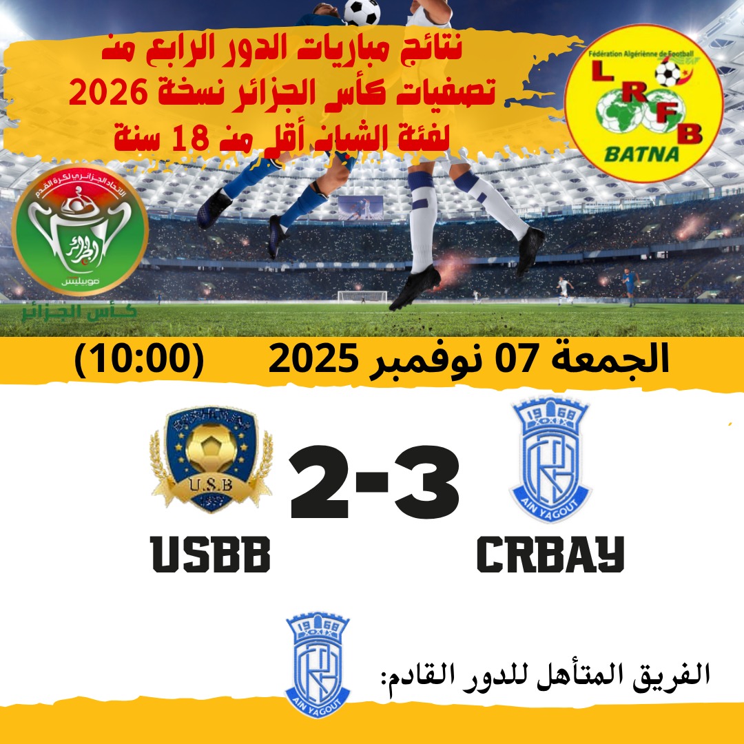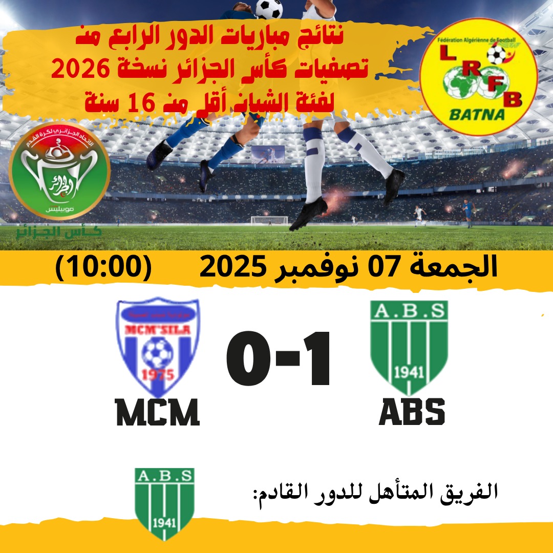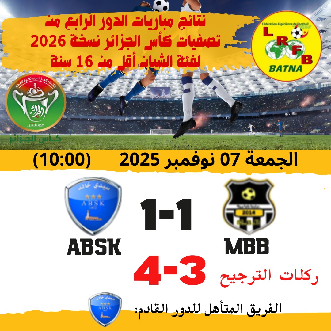 | نتائج مباريات الدور التصفوي الرابع لكأس الجزائر 2026 للشبان ... التاريخ: الجمعة 07 نوفمبر 2025 |