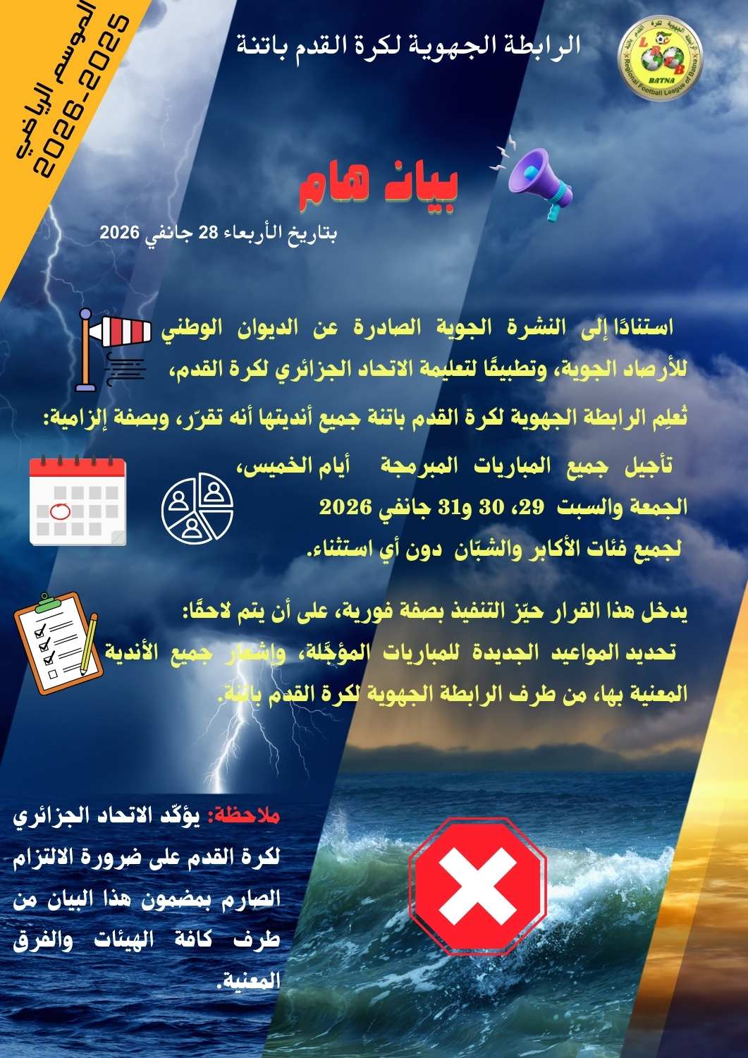 | 🟥🟥🟥 📢 بيان هام 🟥🟥🟥 بتاريخ الأربعاء 28 جانفي 2026: تأجيل جميع المباريات المبرمجة نهاية الأسبوع |